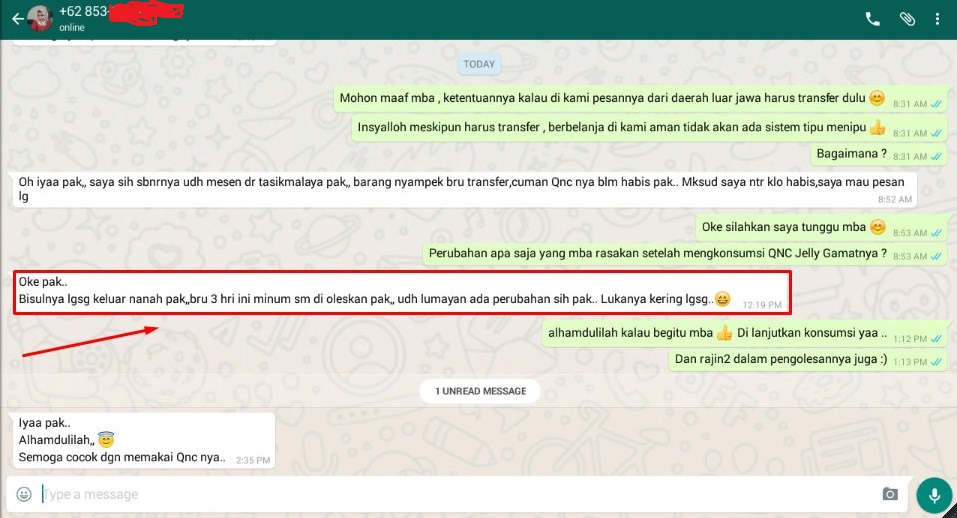 Sudah banyak konsumen kami yang merasakan betul khasiat dari Obat QnC Jelly Gamat ini untuk menghilangkan cenang secara alami sampai tuntas, beberapa kesaksian konsumen yang sudah mengkonsumsi QnC Jelly Gamat berikut penuturan mereka.